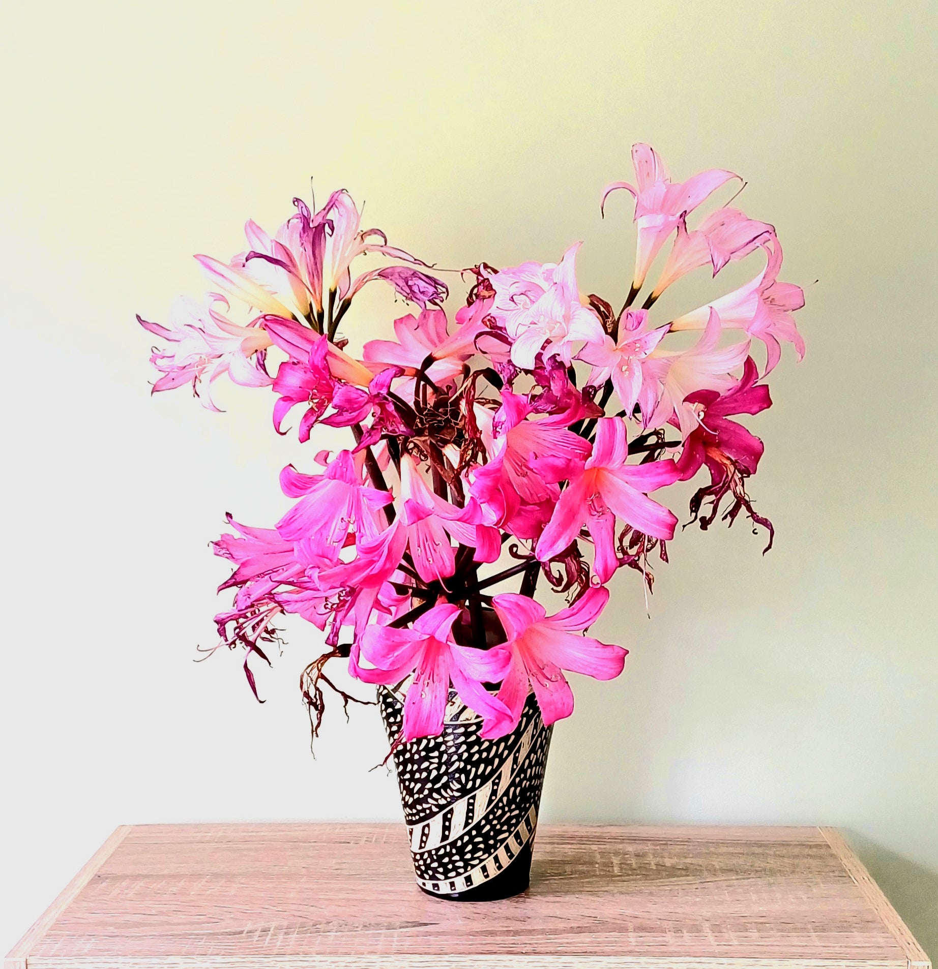 "Amaryllis belladonna has the common name Naked Ladies because the flower emerges from the bulb from late summer. Bella donna means beautiful lady. The leaves emerge after the flowers have faded and grow throughout the winter. Although long considered to be a true species, it has been shown to be a naturally occurring hybrid.