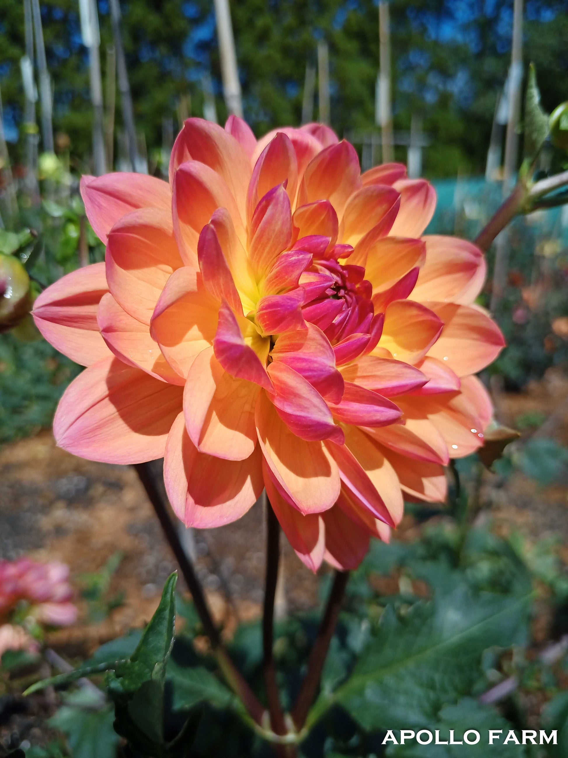 Beautiful rich apricot, peach and pink waterlily with a yellow center. Pronounced veins create a stained glass like effect with backlighting in the evening. Regular winner in the Waterlily section at Dahlia shows. Long brown stems and long vase life. Looks great in a bright and cheerful tropical bouquet of flowers. Can also be displayed floating in a bowl on a table. (I Jones, UK, 2005)